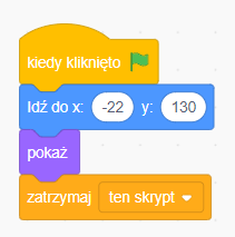 4) Na środku będą wyświetlały się duchy papieru, nożyc i kamienia. Mają być docelowo w tych samych miejsach (zwróć uwagę na wartości x i y dla danego koloru - mają być takie same). W tym momencie duszki mają być NIEWIDOCZNE (wsk. ukryj) ale mają mieć wskazane miejsce do pokazania się. Skrypty również zbudowane są na podobnej zasadzie jak poprzednio (inne wartości x oraz y plus inna wartość widoczności). Te duszki mają mieć rozmiar 50.