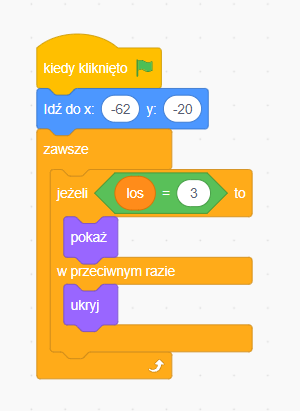 - ustaw zmienną LOS na LOSUJ LICZBĘ OD 1 DO 3 (zmienne, wyrażenia)
